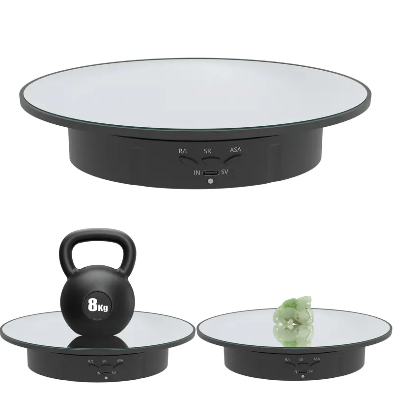 electric rotating display stand with smooth 360° rotation, perfect for showcasing products, collectibles, jewelry, and merchandise.